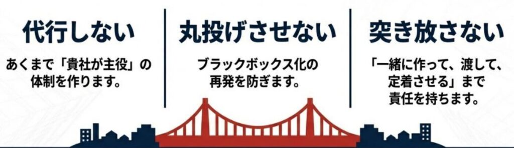 仕組みを作って終わりではなく、担当者が変わっても回る状態になるまで責任を持ちます。
