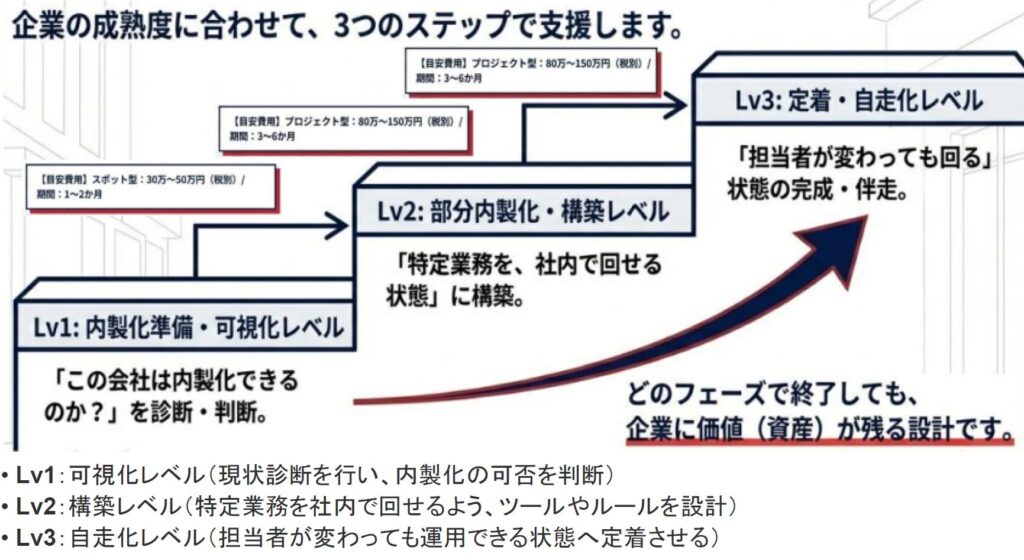 神戸中央人事労務コンサルティングが提供する「内製化支援」は、まさにここを目指しています。