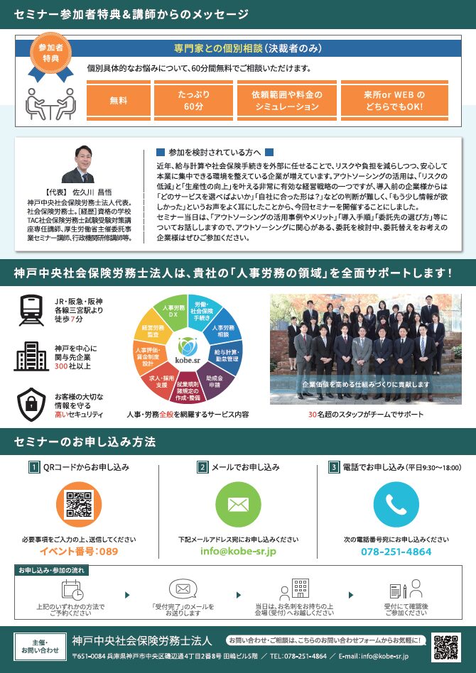 セミナー当日は、「アウトソーシングの活用事例やメリット」「導入手順」「委託先の選び方」等についてお話しますので、アウトソーシングに関心がある、委託を検討中、委託替えをお考えの企業様はぜひご参加ください。
